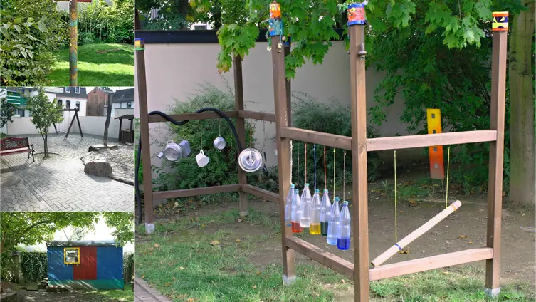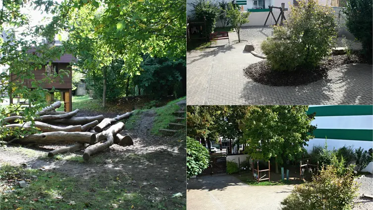 Natur erleben in der Stadt Die Zeiten, in denen die Dorfwiesen den Kindern ein buntes Meer mit unendlich vielen Erlebnis- und Spielmöglichkeiten boten, sind keine Selbstverständlichkeit mehr. Unser Außengelände ist daher als naturnaher Spielplatz angelegt. Kinder brauchen eine Umwelt, in der sie ihre Phantasien spielend entfalten können. Sie wollen klettern, matschen, fühlen, tasten, riechen, laufen, hüpfen und vieles mehr. Das Außengelände erstreckt sich auf 1000 m2 und ist unterteilt in Eingangsbereich, Sandhof und Wiese. Durch die angrenzenden Wohnhäuser haben die Kinder mit der unmittelbaren Nachbarschaft Kontakt.